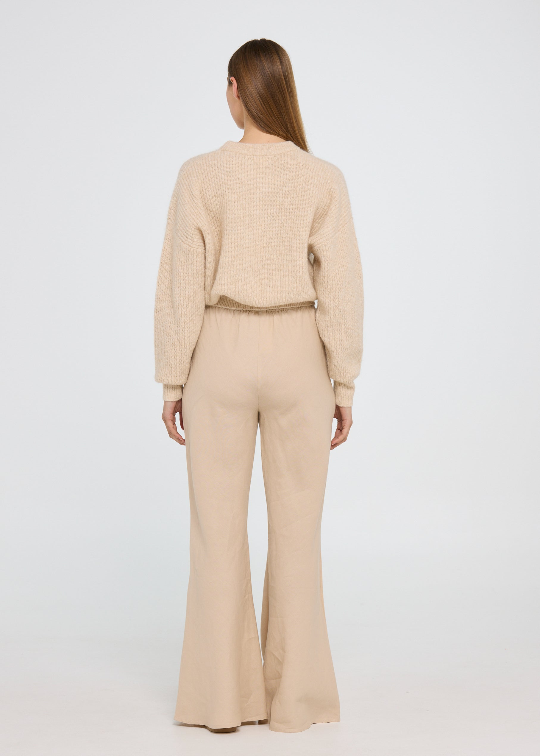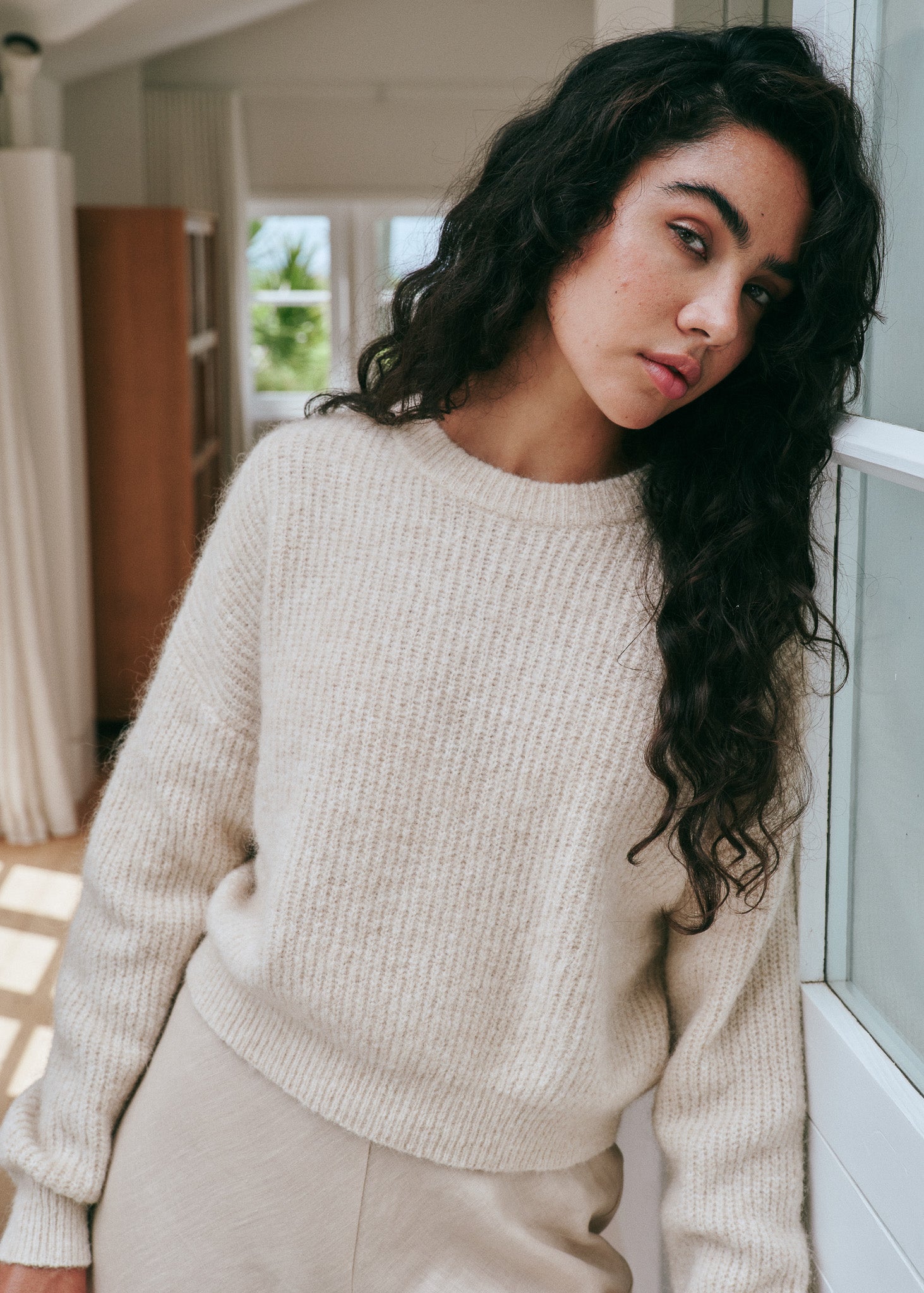 Made from a Mohair Nylon Wool Spandex blend, this textured knit offers a slouchy cropped fit. Featuring a crew neckline, dropped shoulder line with ribbed hem basks.