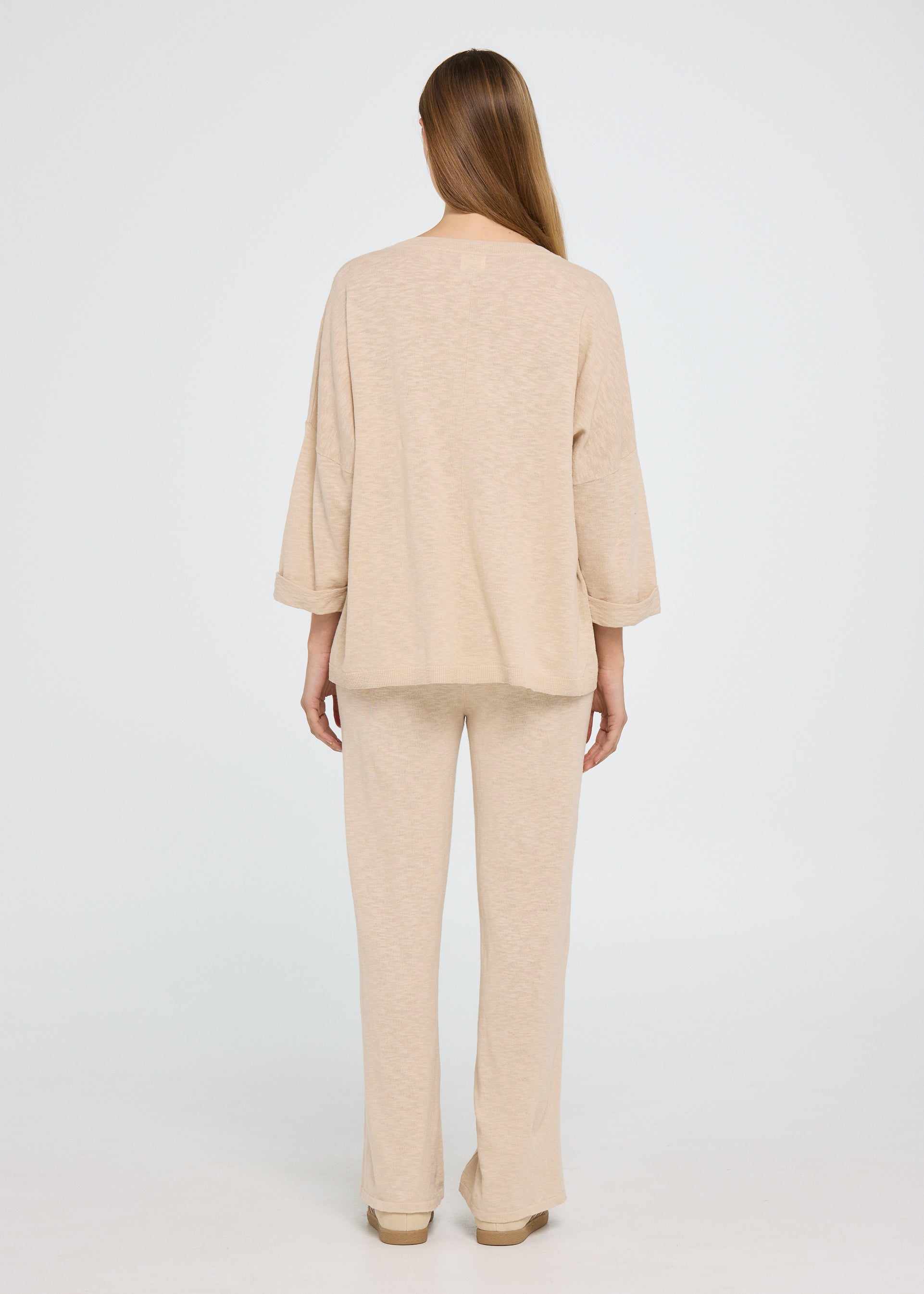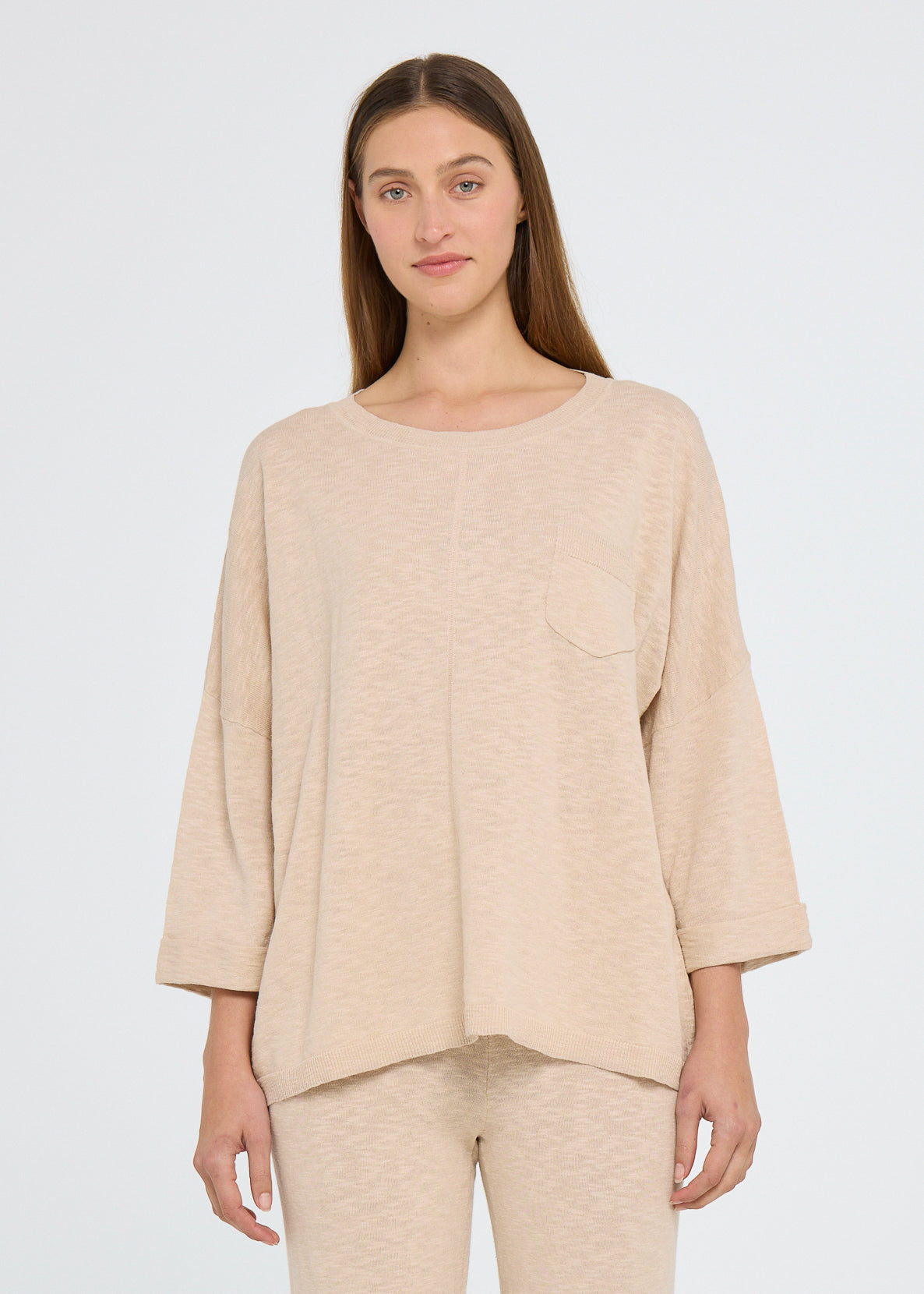 Linen Jersey perfection. Crafted from 75% Cotton, 25% Linen, the Lina Top is perfect for those wanting a bit more sleeve. Featuring a ribbed rounded neckline, exposed centre front seam and 3/4 sleeve, this oversized top pairs perfectly with the Braelyn Short and Everyday Pant.