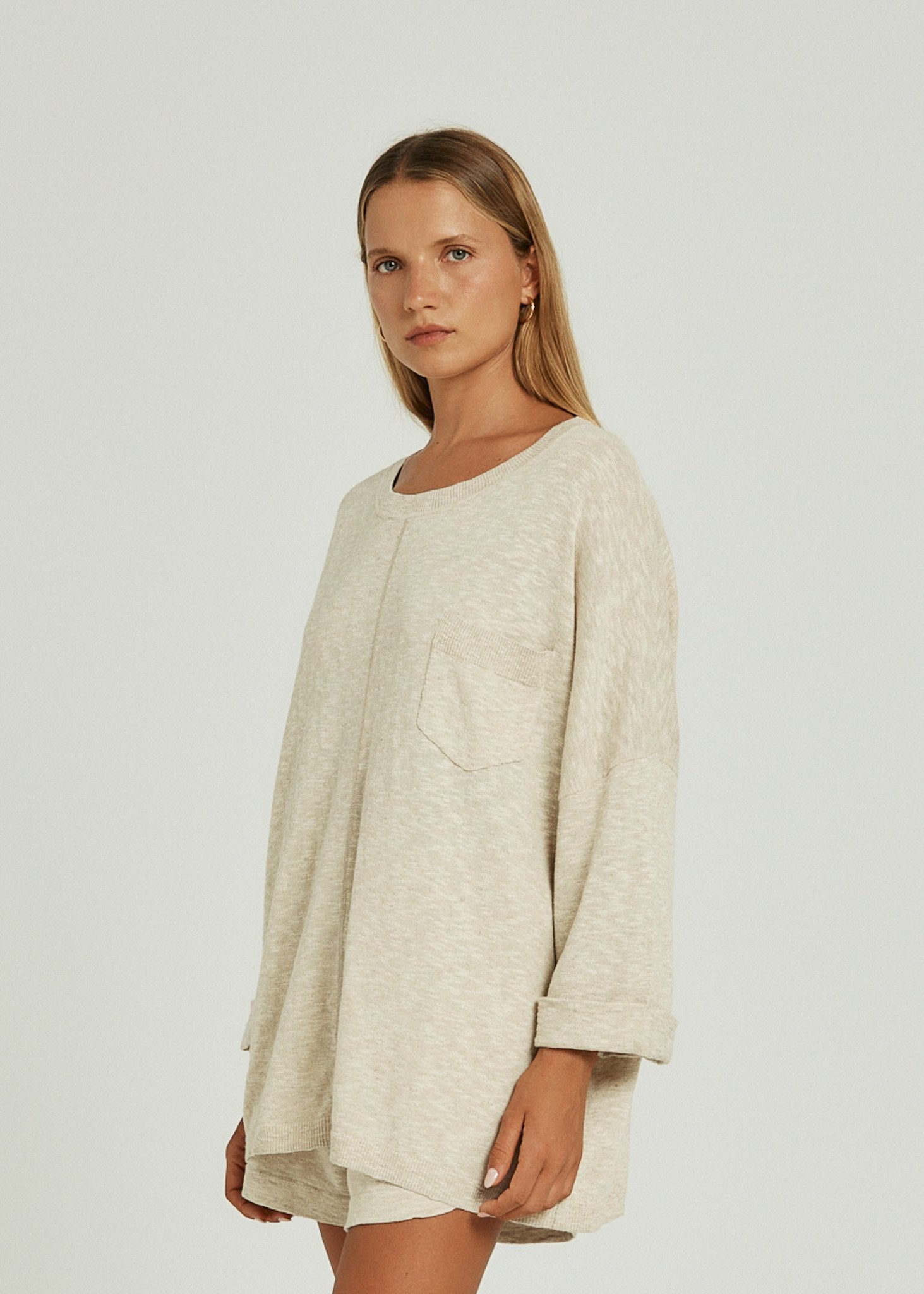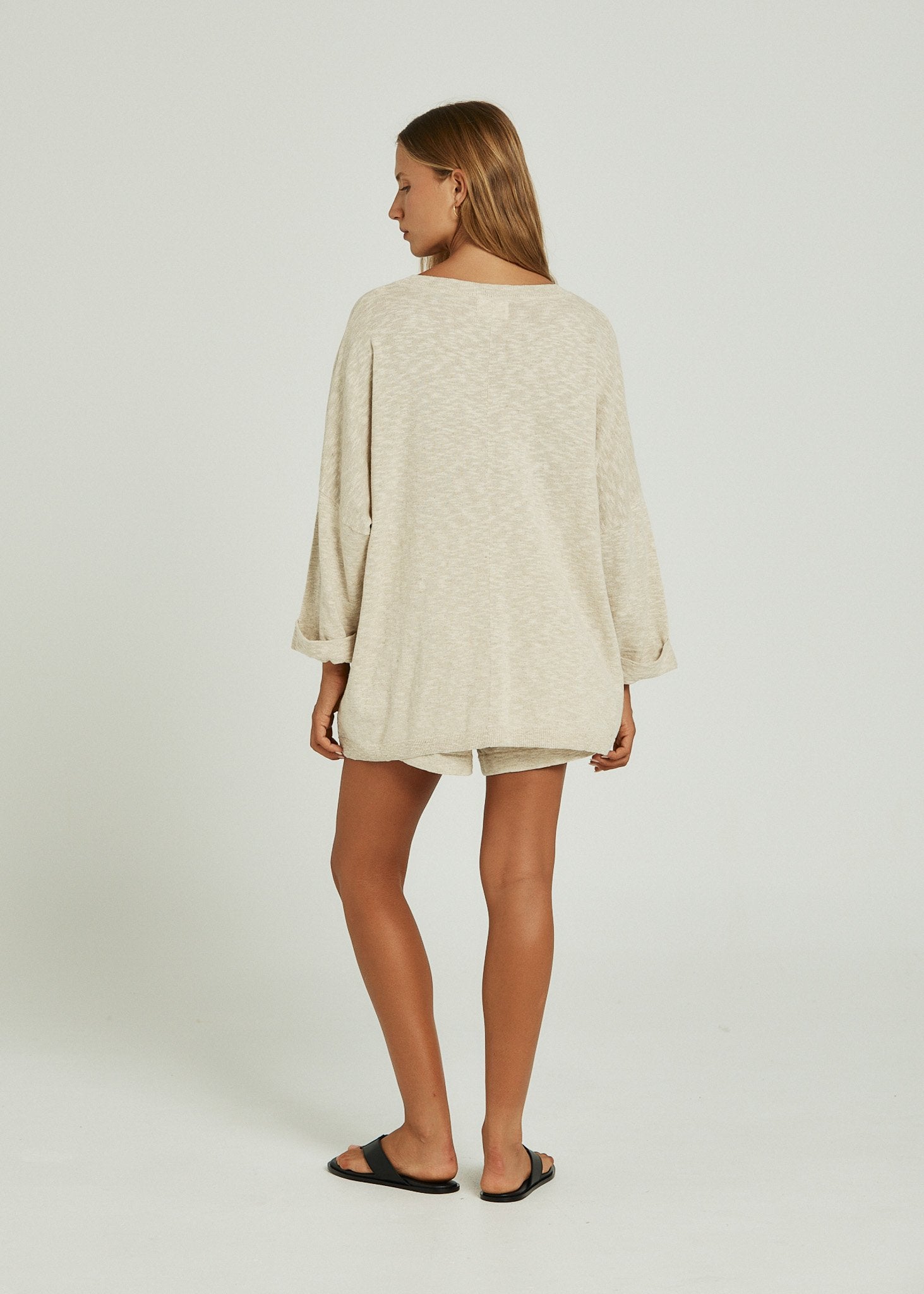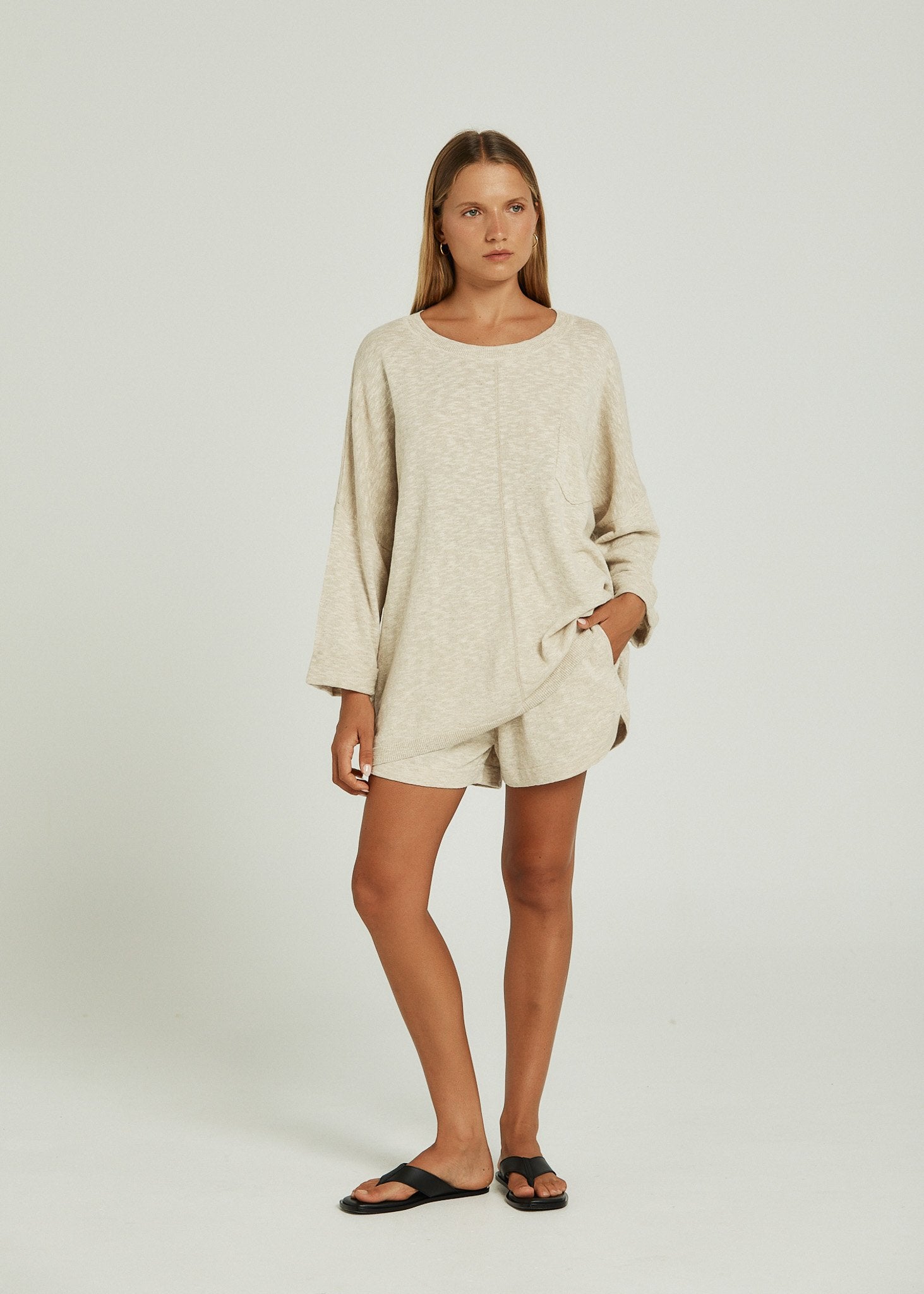 Linen jersey perfection. Crafted from 75% Cotton, 25% Linen, the Lina Top is perfect for those wanting a bit more sleeve. Featuring a ribbed rounded neckline, exposed centre front seam and 3/4 sleeve, this oversized top pairs perfectly with the Braelyn Short and Allyson Pant.