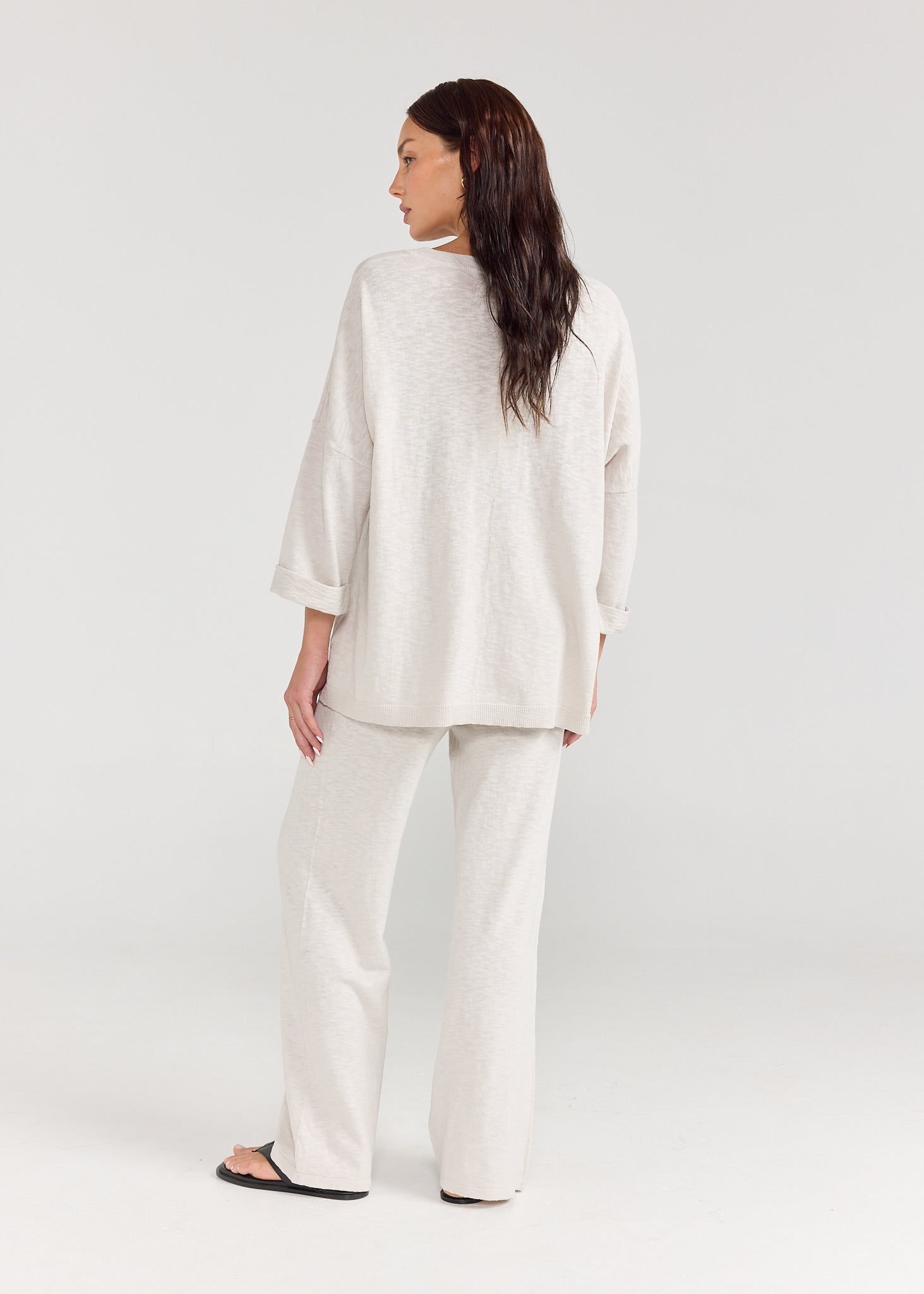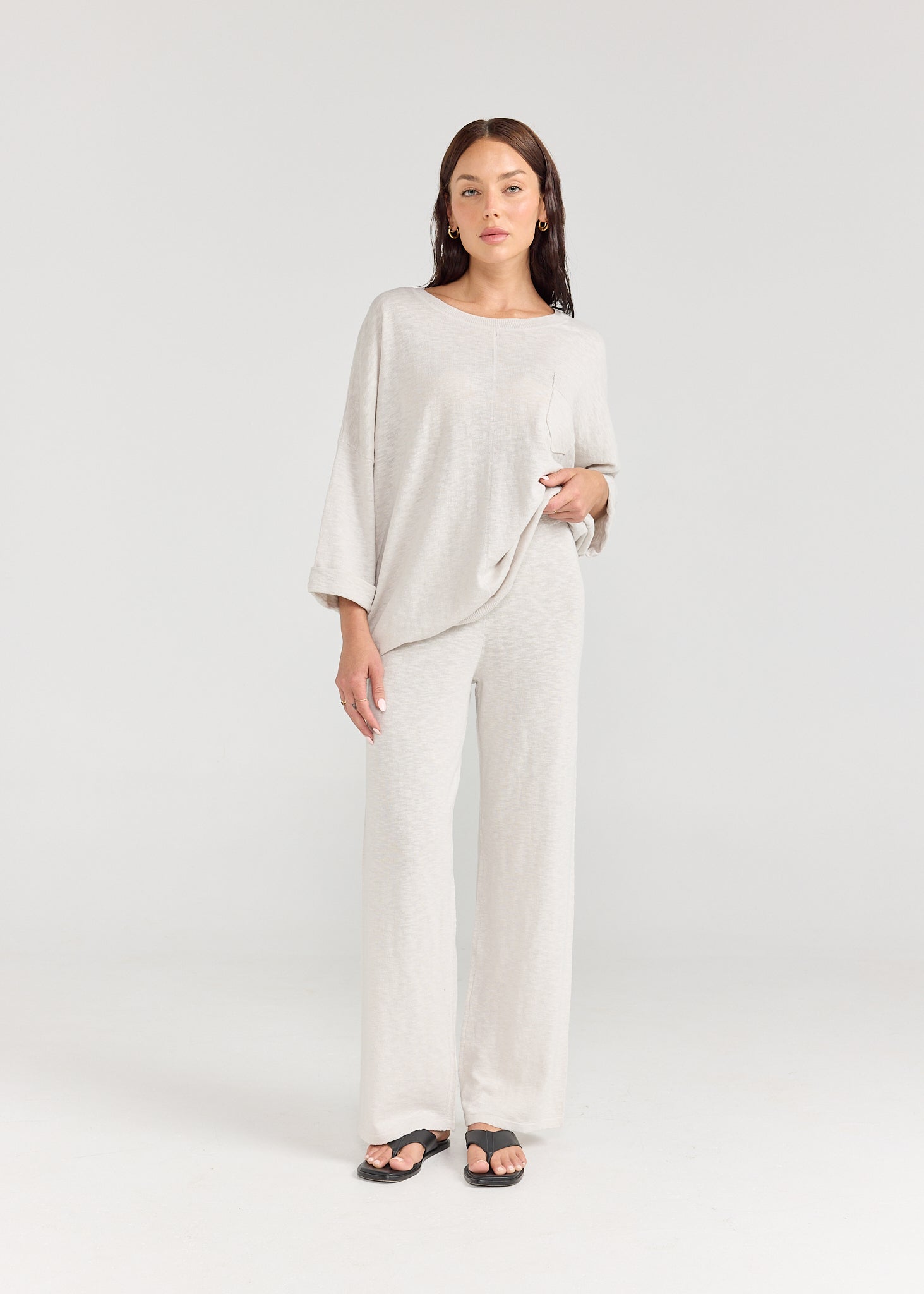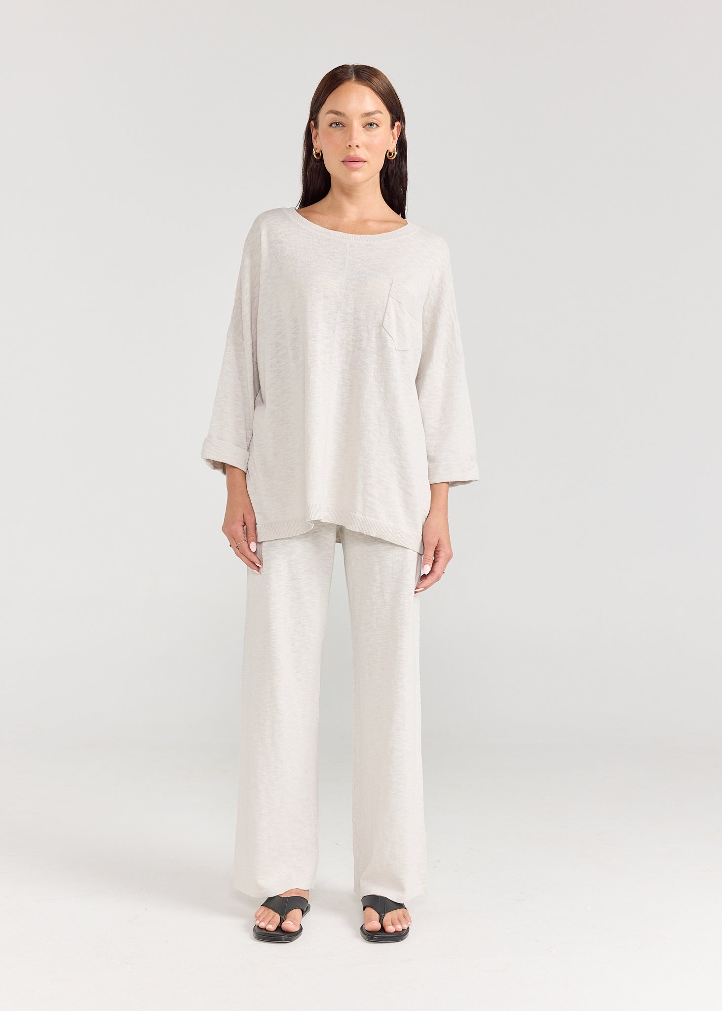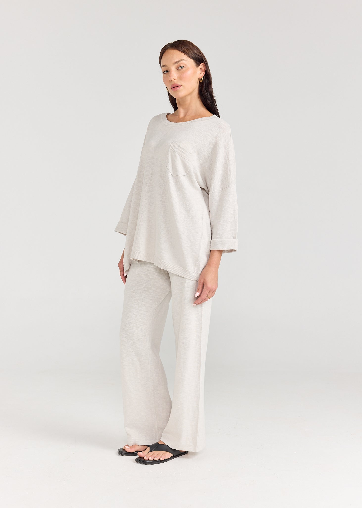 Linen Jersey perfection. Crafted from 75% Cotton, 25% Linen, the Lina Top is perfect for those wanting a bit more sleeve. Featuring a ribbed rounded neckline, exposed centre front seam and 3/4 sleeve, this oversized top pairs perfectly with the Everyday Pant.