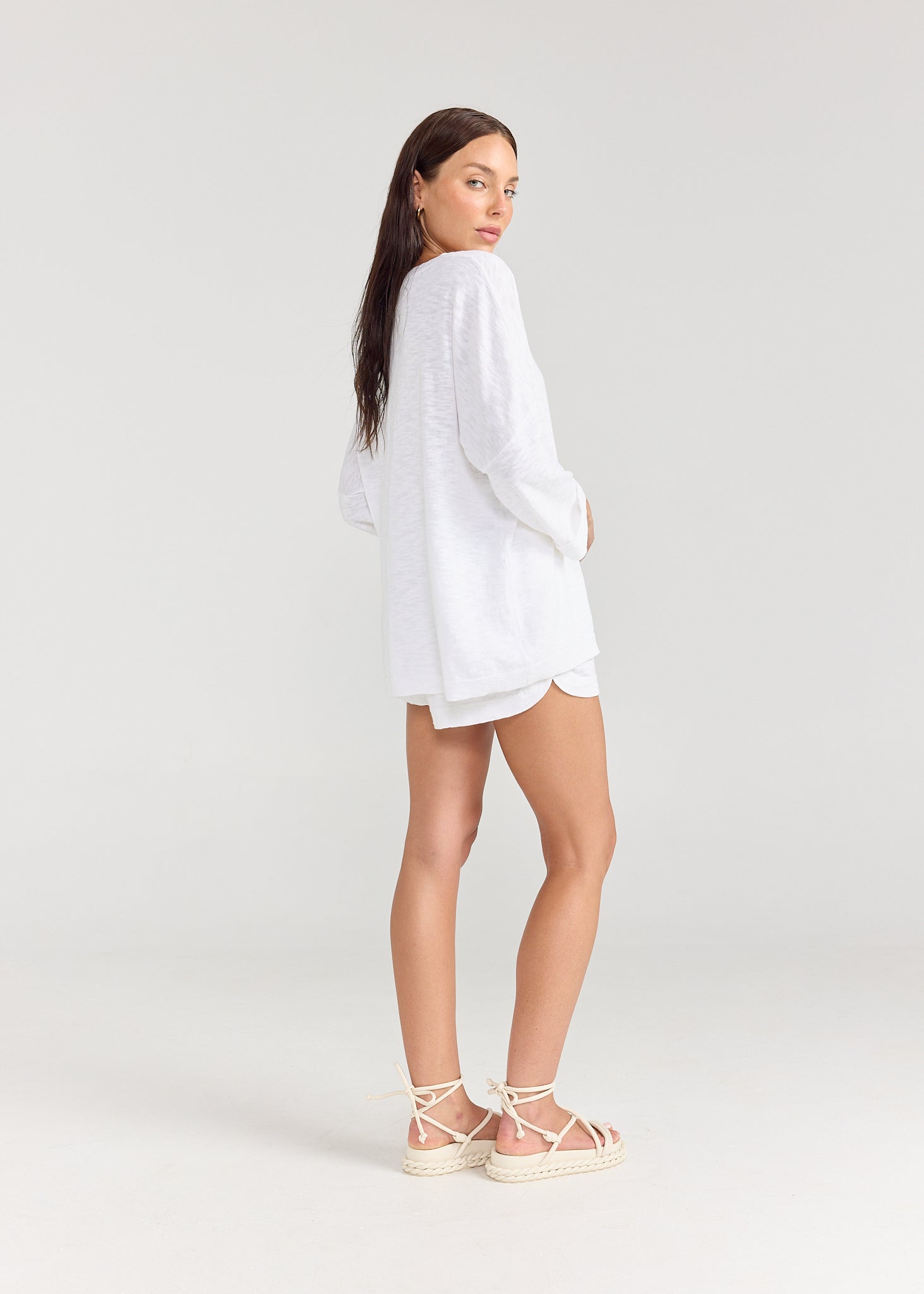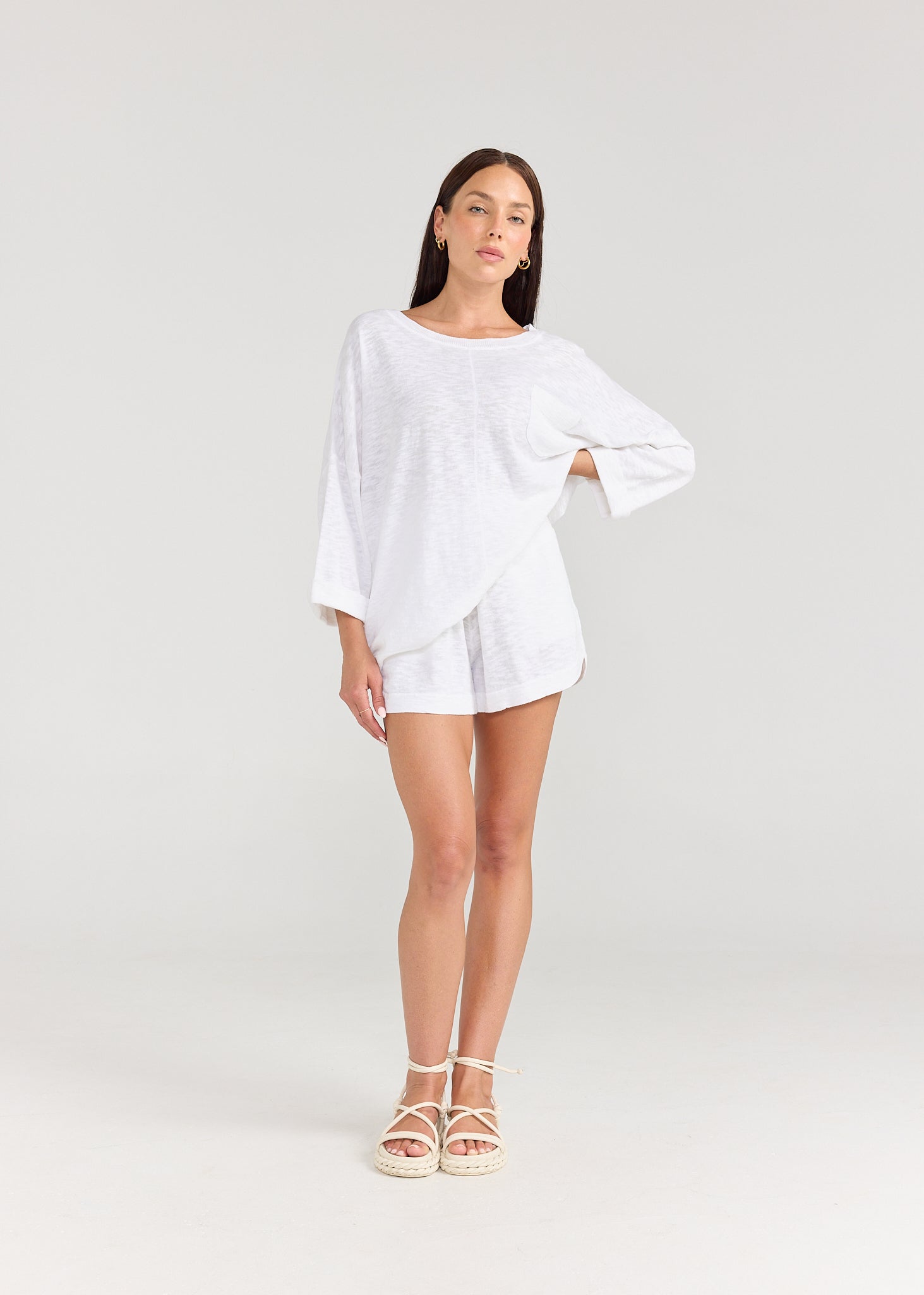 Linen Jersey perfection. Crafted from 75% Cotton, 25% Linen, the Lina Top is perfect for those wanting a bit more sleeve. Featuring a ribbed rounded neckline, exposed centre front seam and 3/4 sleeve, this oversized top pairs perfectly with the Everyday Pant for the ultimate cosy winter set.