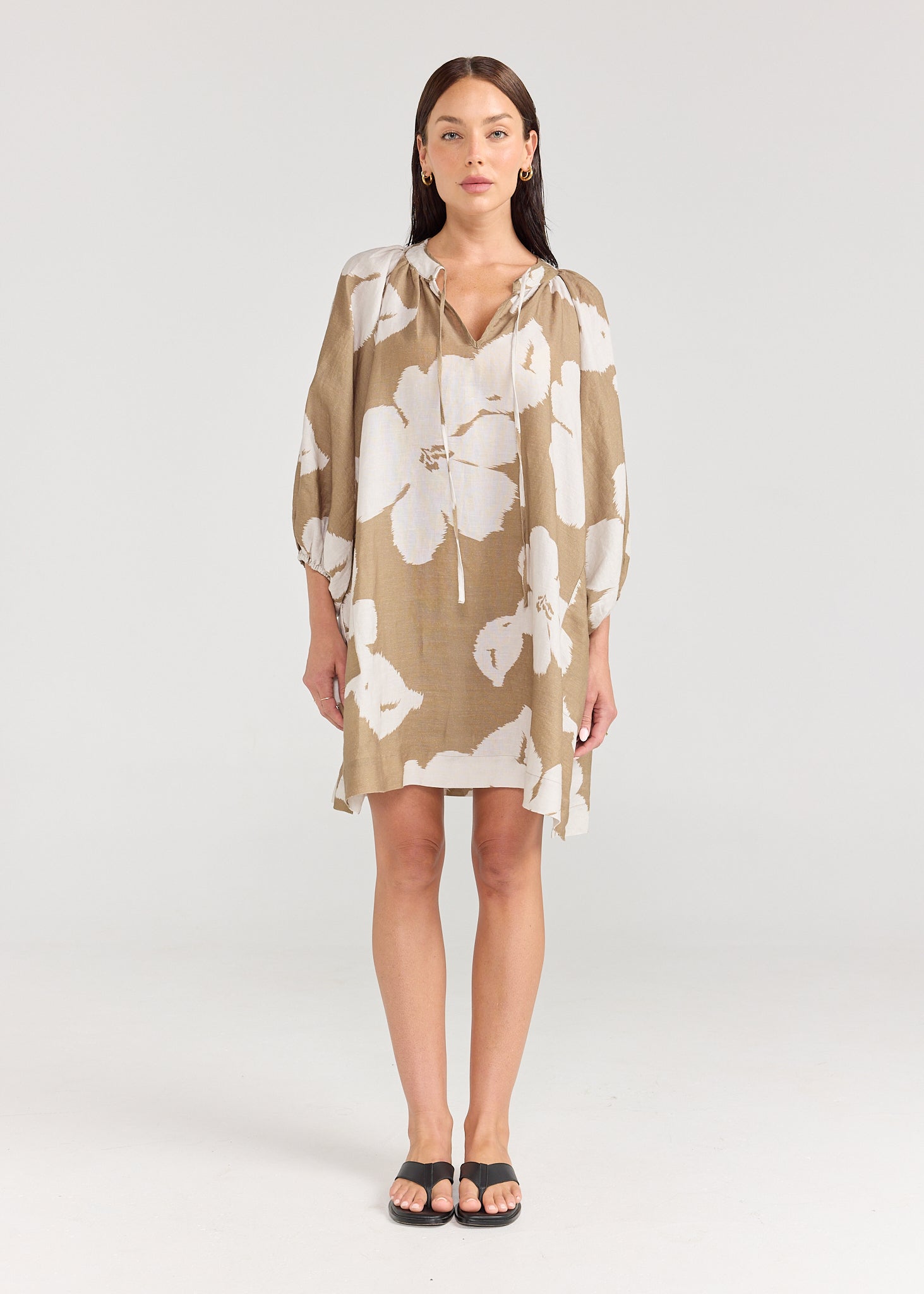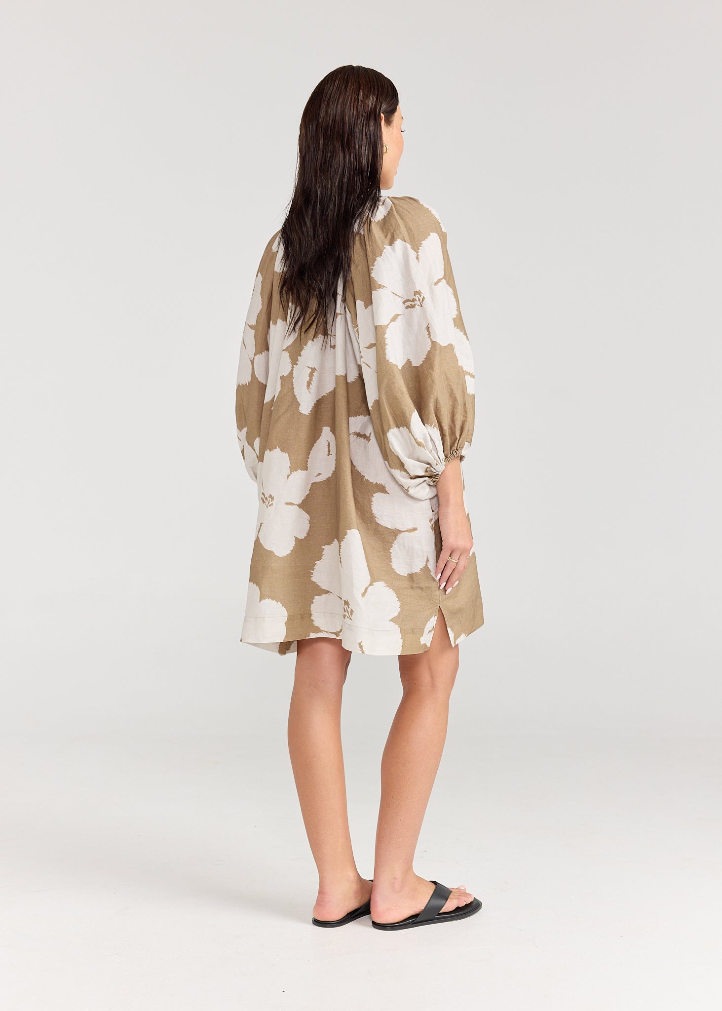 Crafted from 100% Linen, the Sangria Dress is the ultimate trans-seasonal mini. Featuring a gathered neckline with ties, feminine balloon sleeves with elasticated cuffs and side splits.