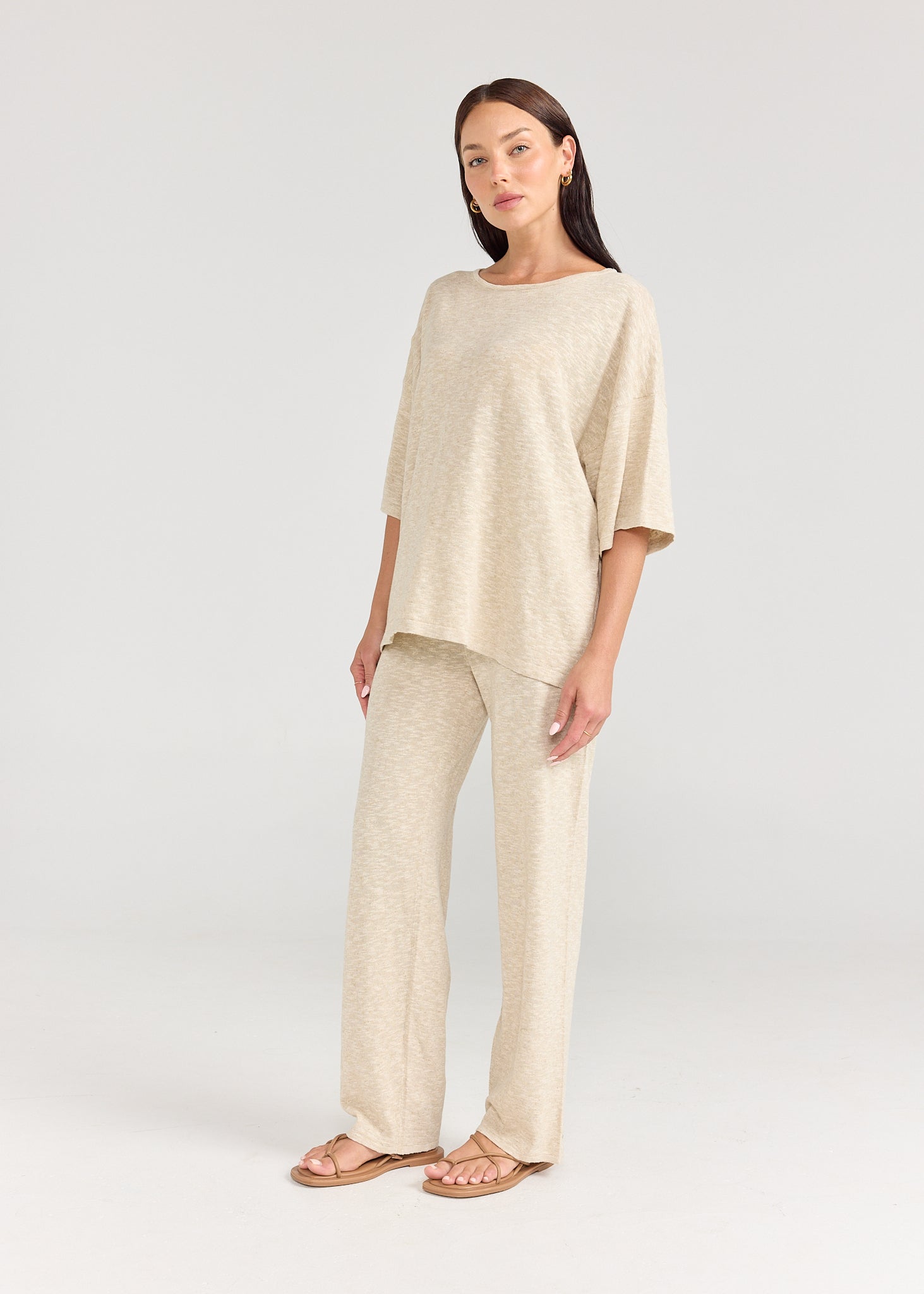 Linen Jersey perfection. Crafted from 75% Cotton, 25% Linen, the Savannah Tee is perfect for those wanting a bit more of an oversized T-shirt. Featuring an elbow length drop shoulder. This oversized top pairs perfectly with the Kamiyah and Everyday Pant.