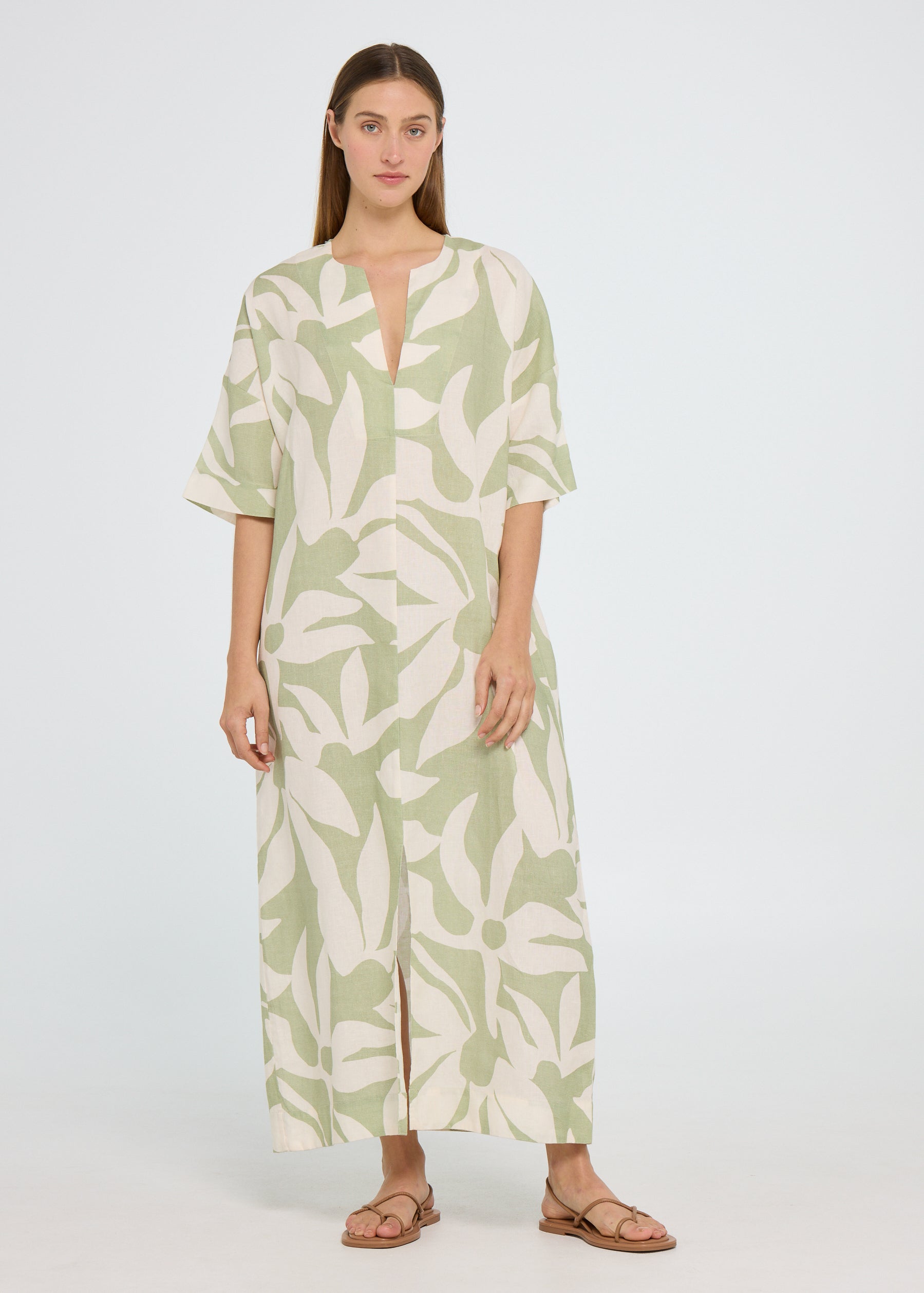 A must-have resort style dress for endless Summer days. Crafted in 100% Linen, the Tulum Maxi is the perfect dress to take you from day to night. This a-line maxi silhouette features a v-neckline, dropped shoulder, mid length sleeve and centre front split.